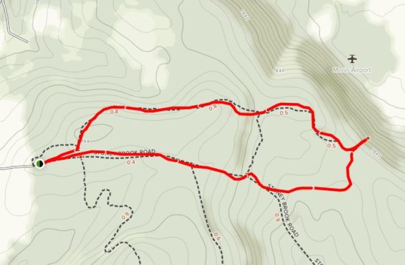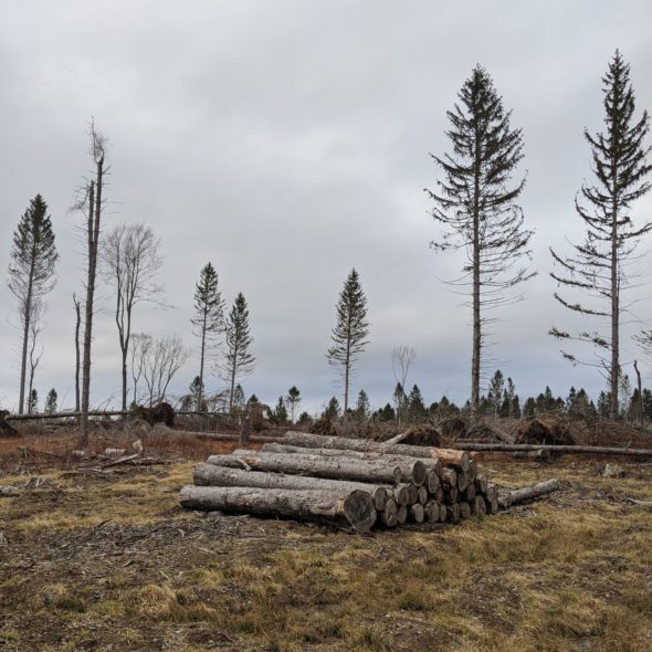 I would proceed down the road, then head north on the trail that would intersect after 0.8 miles. That was my plan. On the way, I would cross the a section of forest that was being thinned on the north side of the road. No check that. It was being harvested.