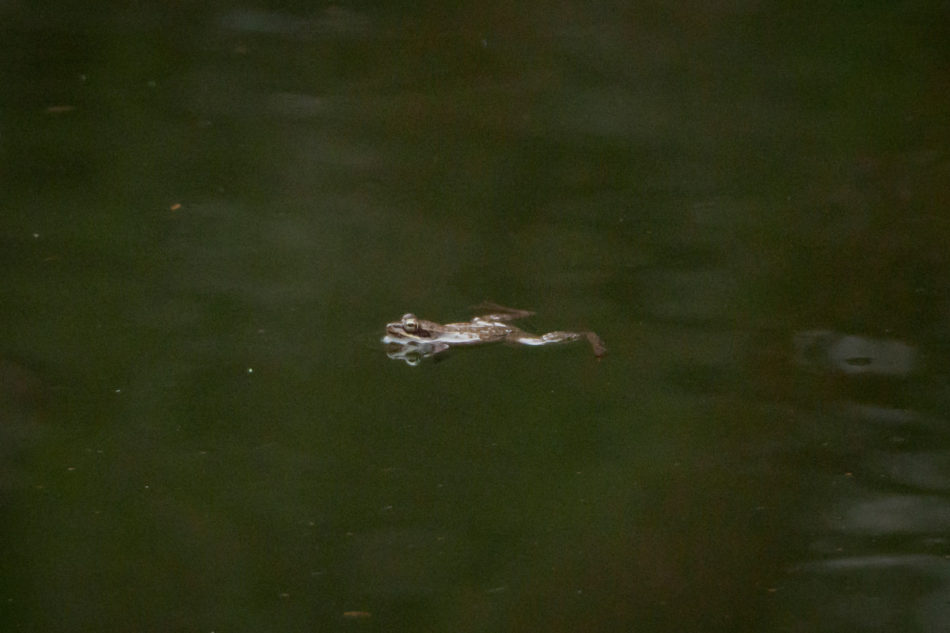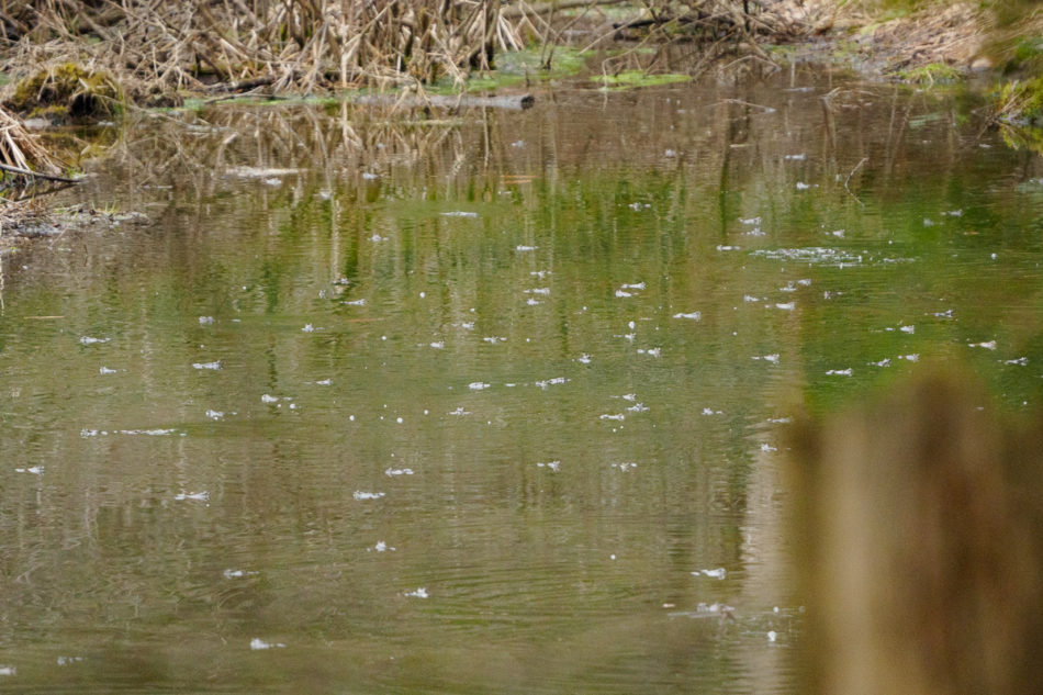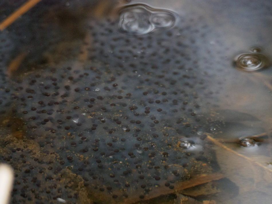 Also on the way, I would hear frogs in the distance; finally I came to a low area filled with water and I could see what the commotion was about. There were thousands of frogs in the woods, and hundreds in the small little piece of water that I photographed here. I think they were mating; I also think that I photographed eggs that will eventually become tadpoles.